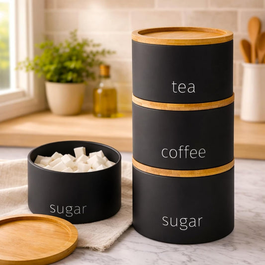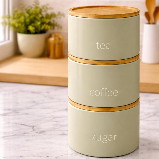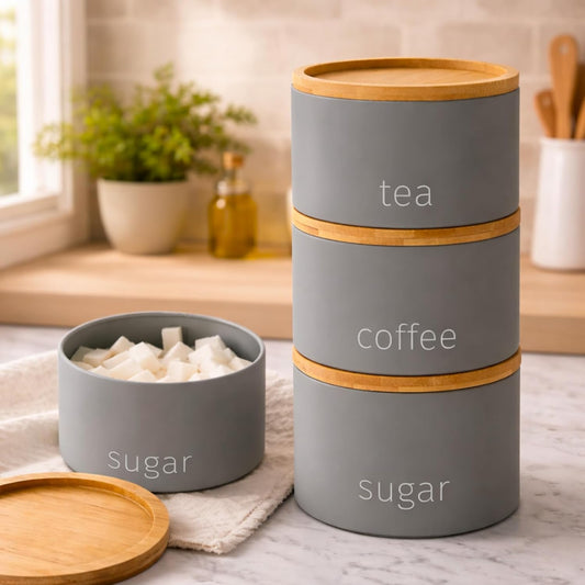 3 Piece Steel Tea Coffee Sugar Set - Airtight Food Storage Jars with Wooden Lids - Contemporary Kitchen Countertop Tidy Containers